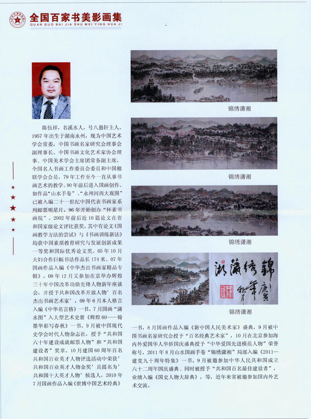 陈伍祥(名溪水人,号八愚轩主人),国家特级书法师、国家一级美术师、中央机关美术家协会会员、全国非物质文化遗产传承人、中国艺术泰斗,1957年出生于湖南永州。1979年参加工作至今一直从事书画艺术教学,历年来有多篇论文分别在省和国家级刊目上发表,其论文多次在省级以上评比中获奖。1995年创办“怀素书画院”,20多年来培养了无数书法、国画等艺术领域人才。
