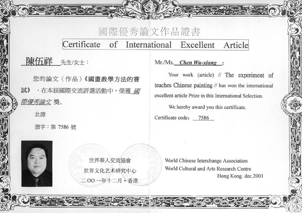 2001年12月论文《国画教学方法的尝试》荣获国际优秀论文奖