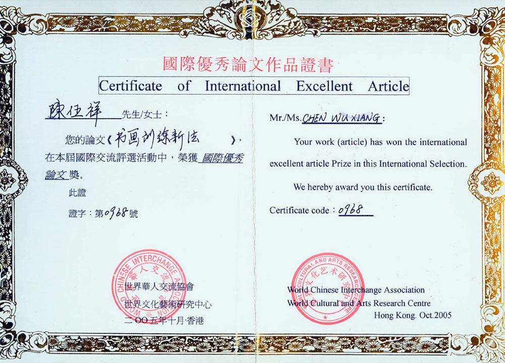 2005年10月论文《书画训练新法》荣获国际优秀论文奖