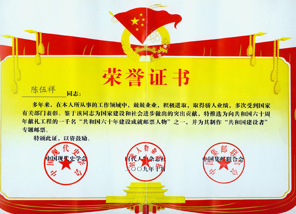 2009年10月入编“共和国六十周年建设成就邮票人物”、“共和国建设者”