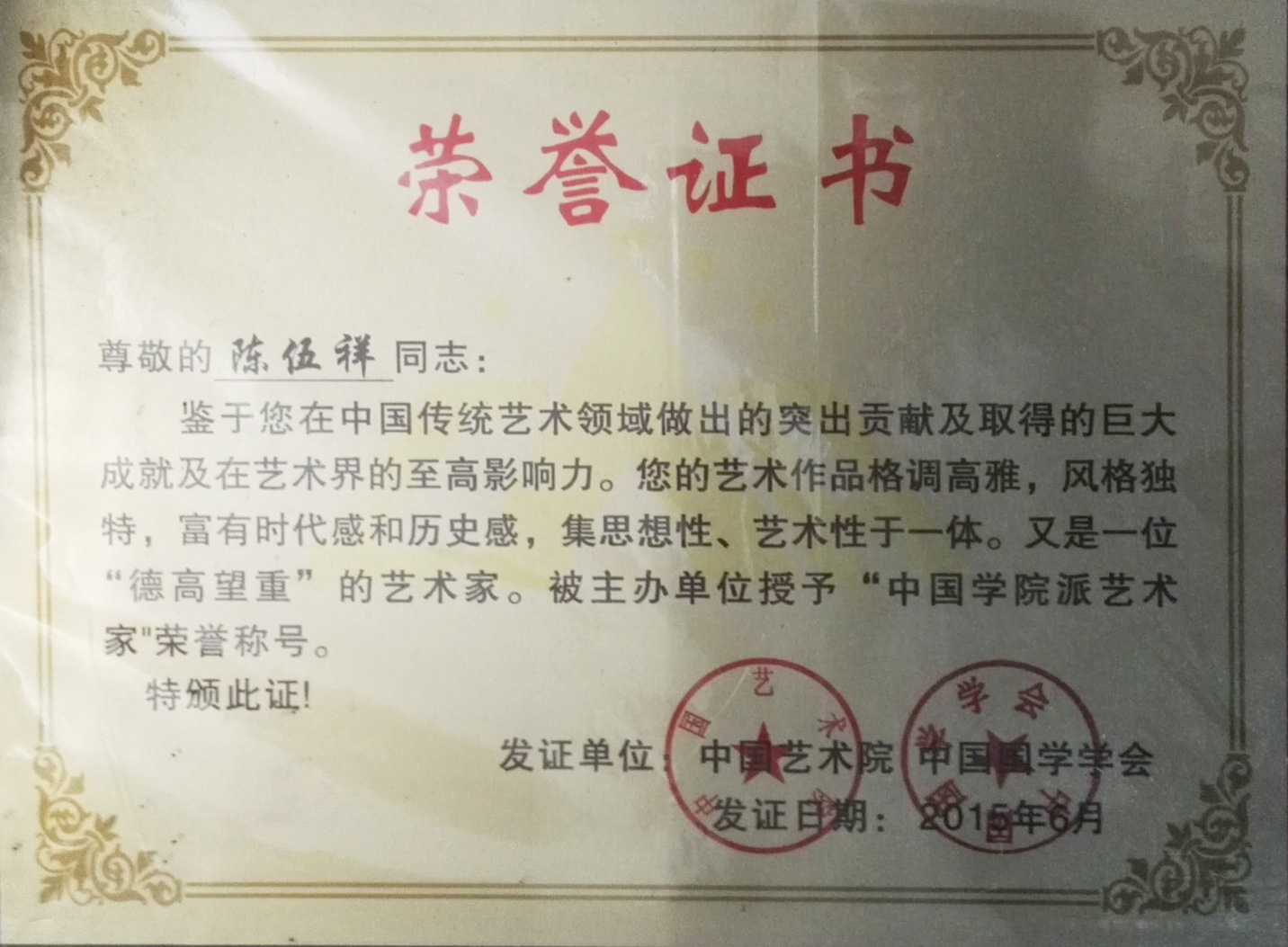 2015年6月被中国艺术院,中国国学学会授予“中国学院派艺术家”荣誉称号