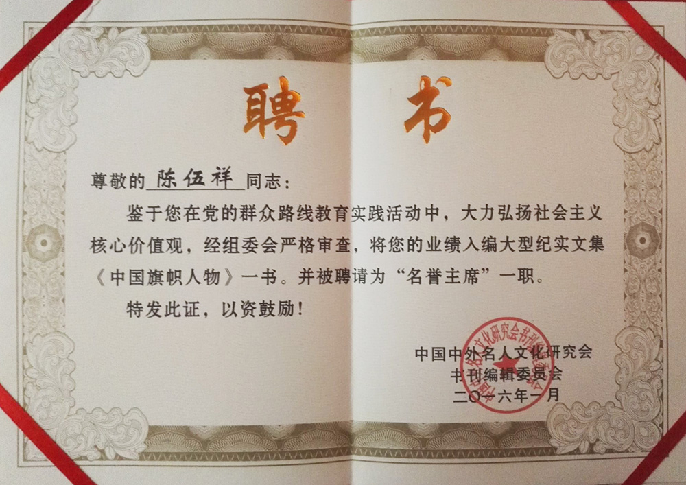2016年1月受聘“中国中外名人文化研究会”名誉主席一职