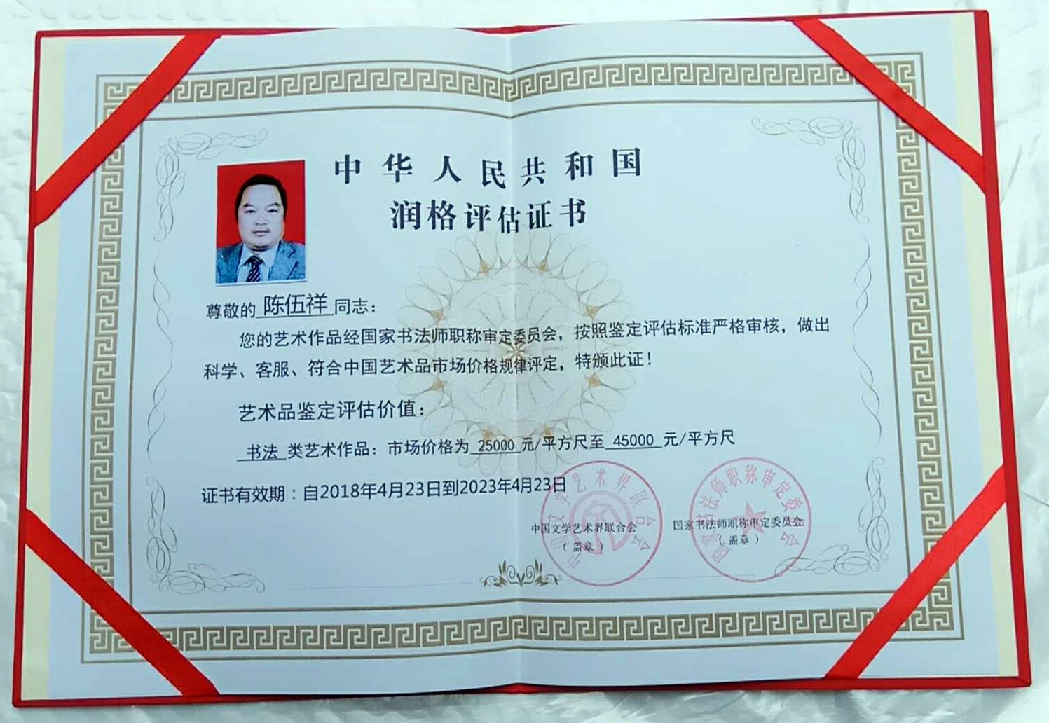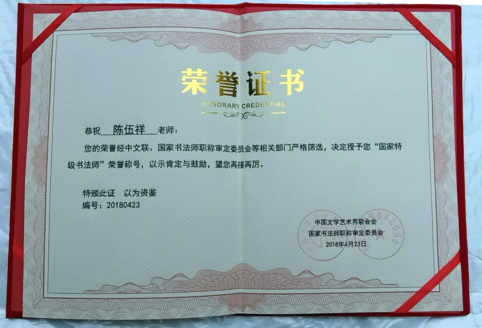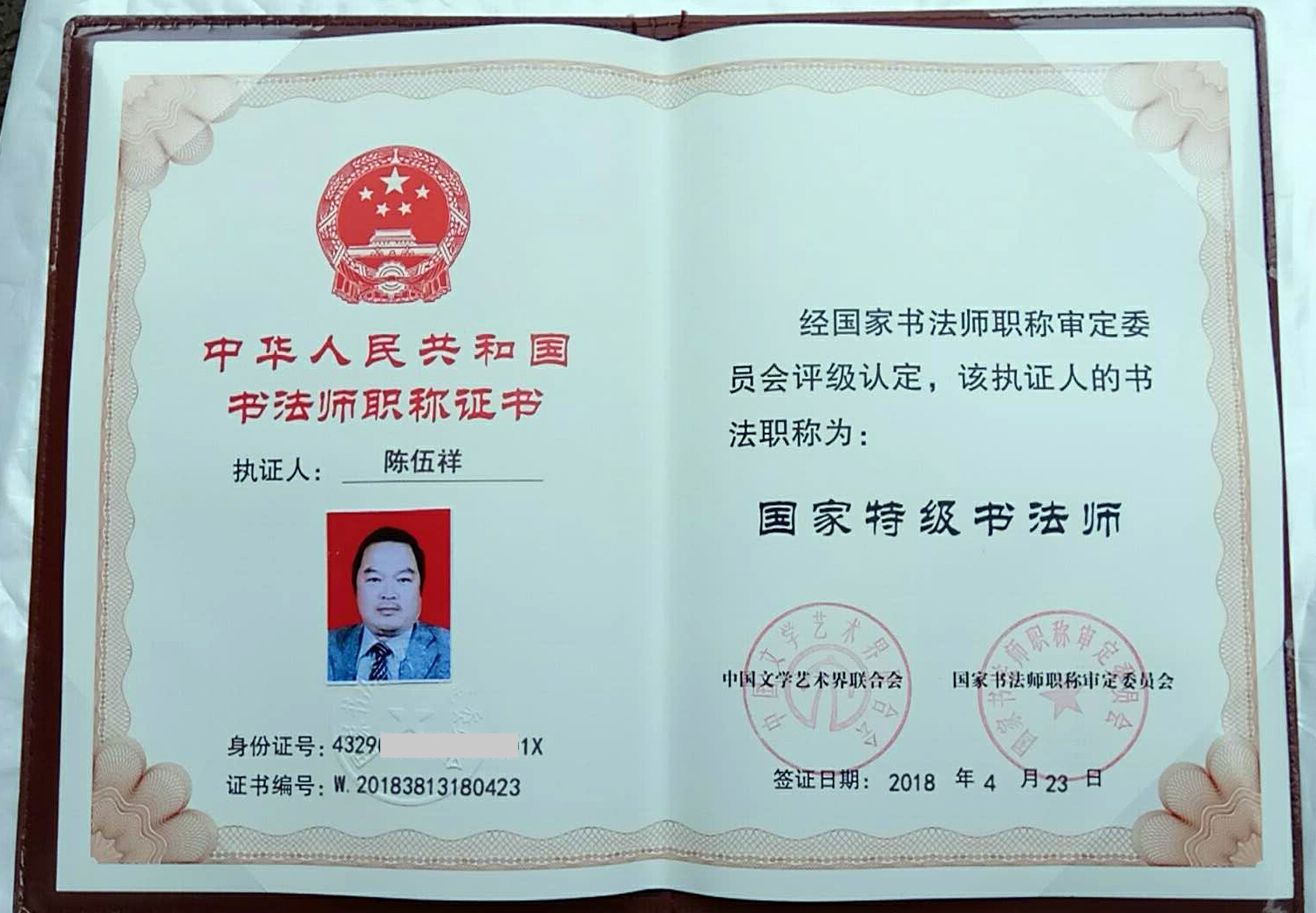 2018年4月份被中国文联授予“国家特级书法师”职称